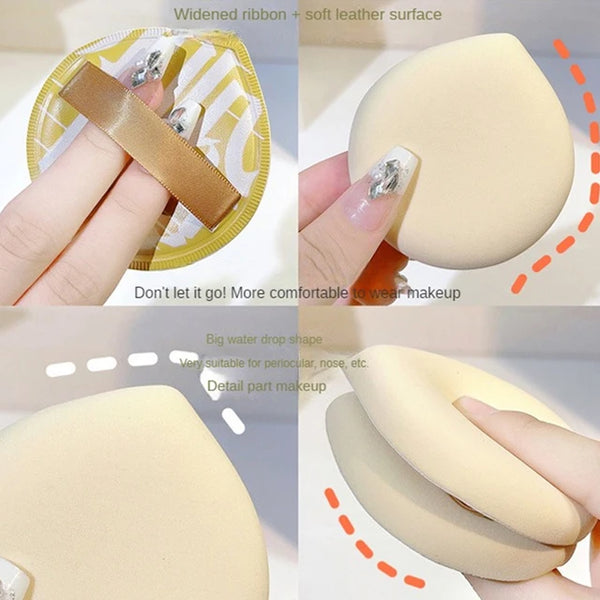 Sfungjerë për make up në formë loti;  Ngjyra: e verdhë, jeshile; me mbajtëse për dorën; përdoret për produkte pudër dhe të lëngshme; Sipërfaqe lëkure