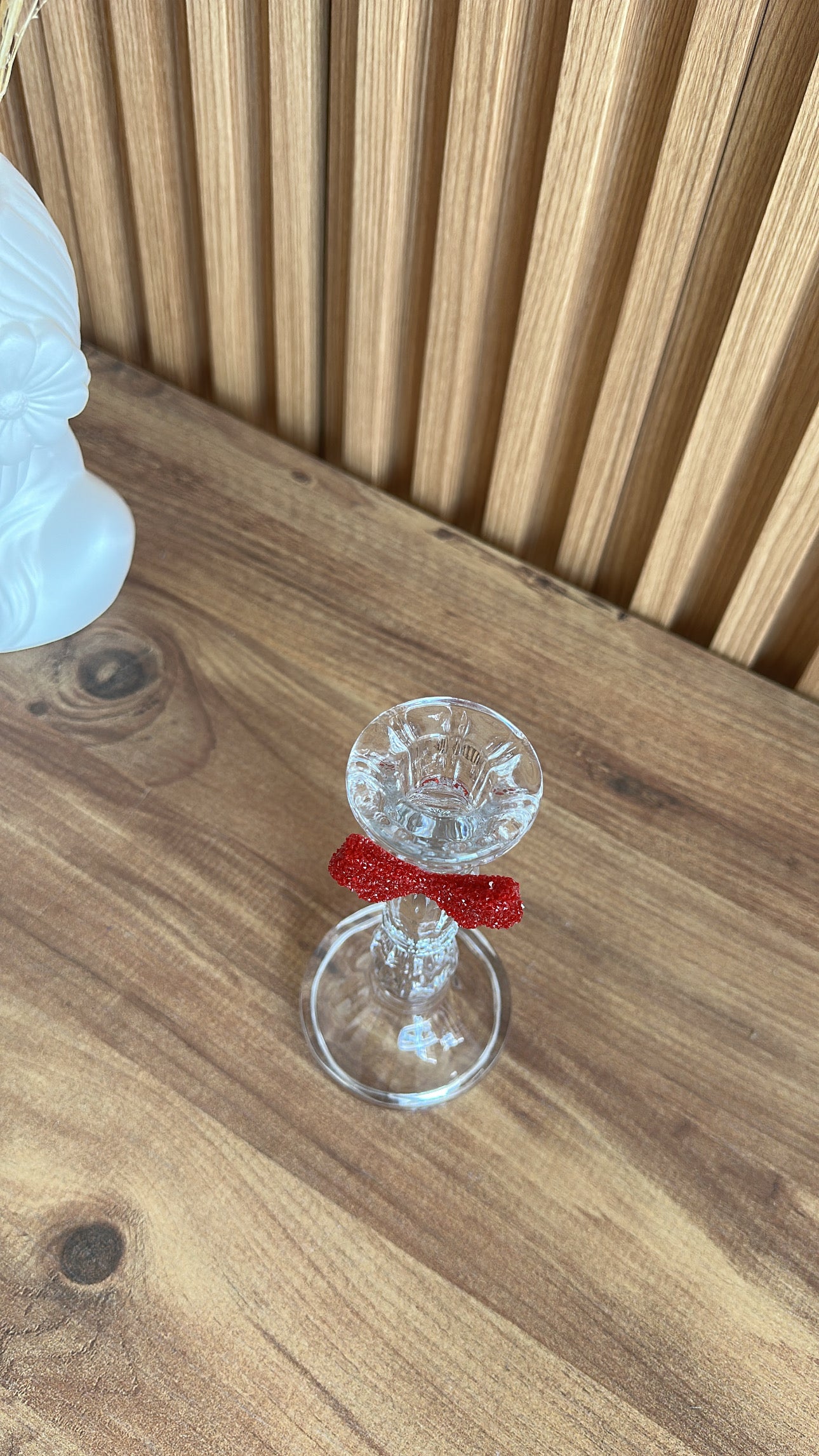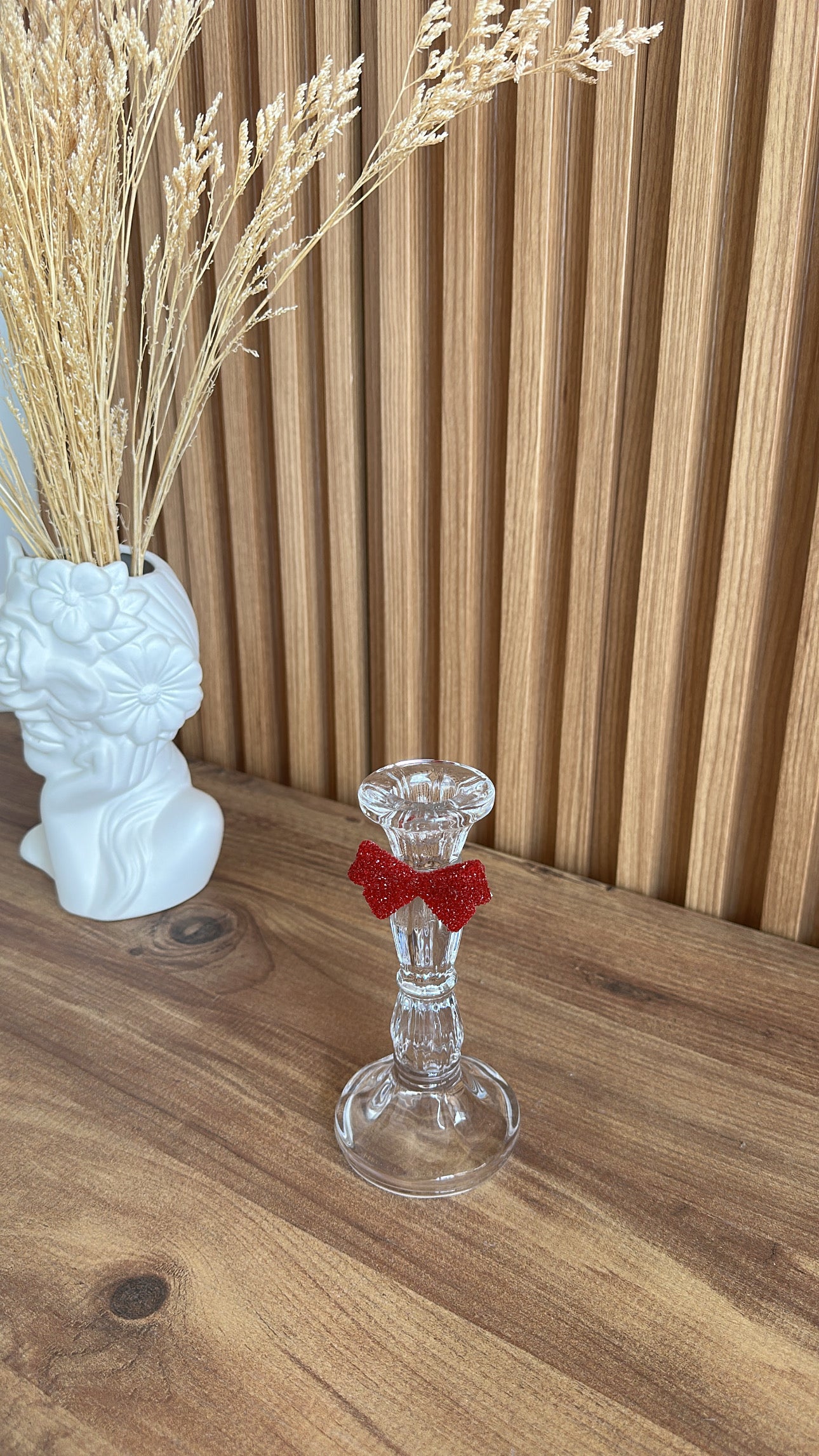 Shandan qelqi transparent për qiri me fjongo të kuqe