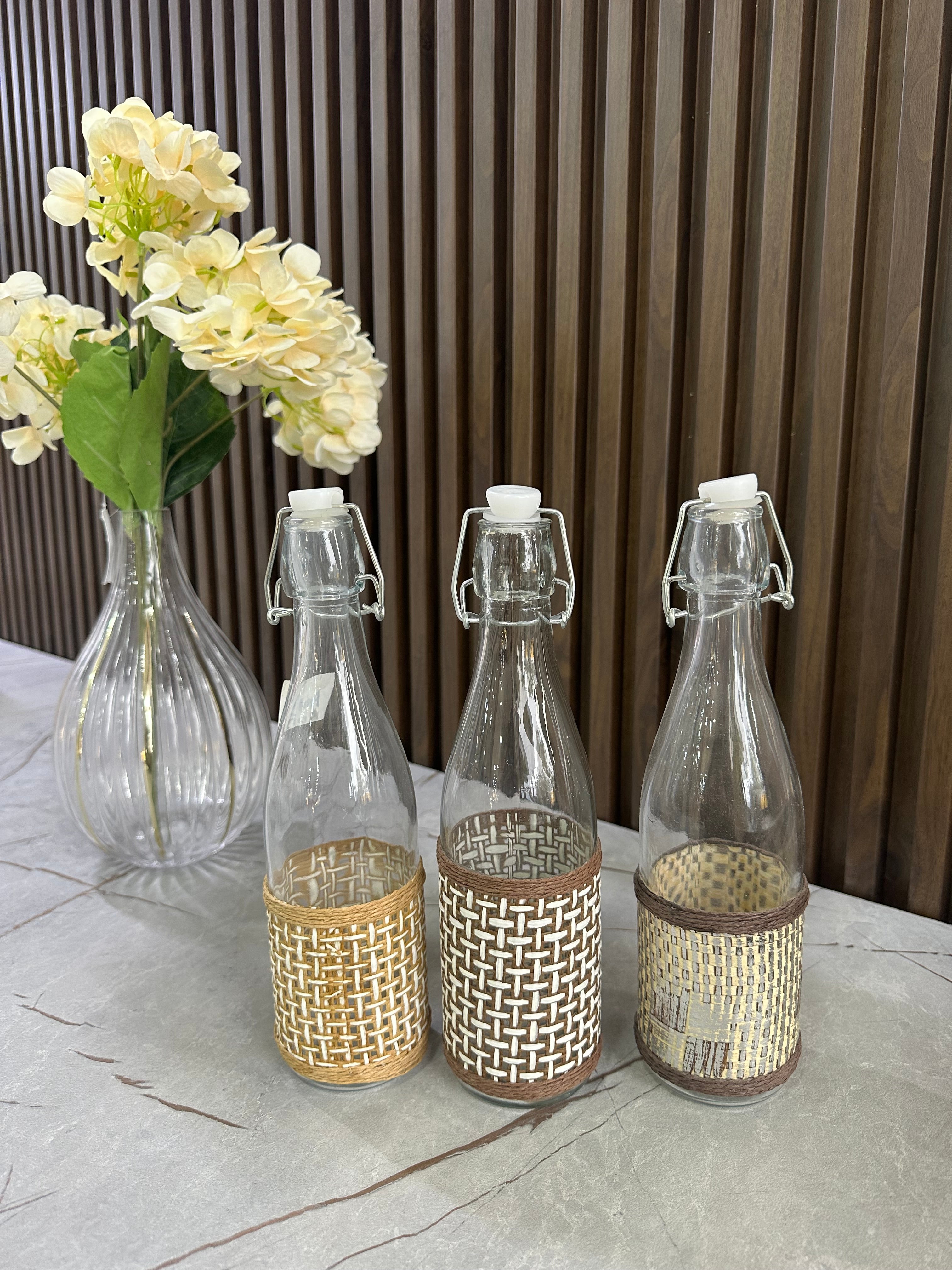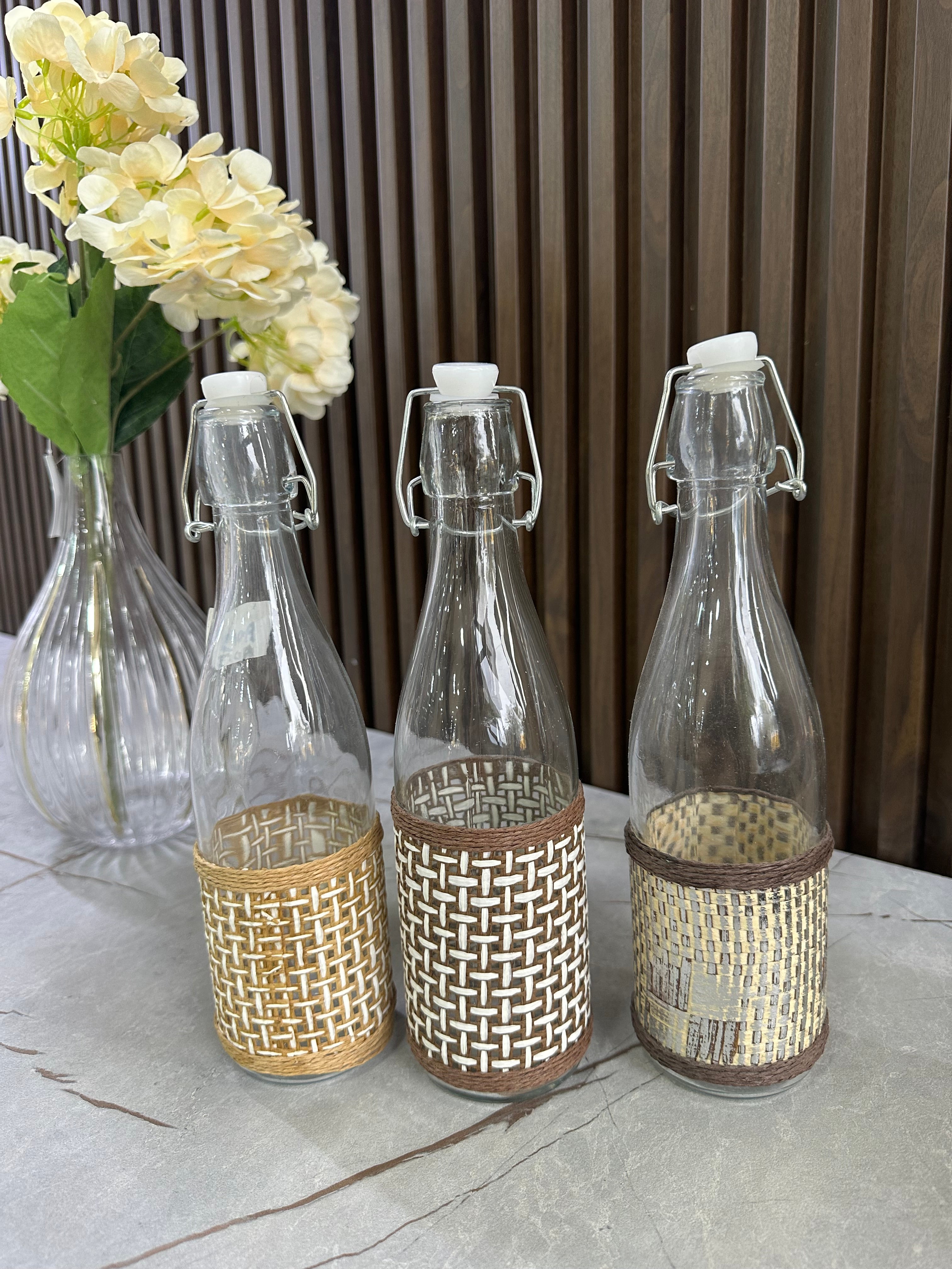 Shishe qelqi dekorative me mbyllje hermetike dhe mbështjellje natyrale, ideale për vaj, uthull ose si element dekorativ në kuzhinë. Materiali: Qelq. Ngjyra: Transparente, me veshje nga jashtë. Përmasat: 8 x...