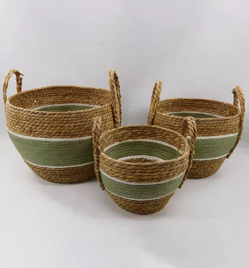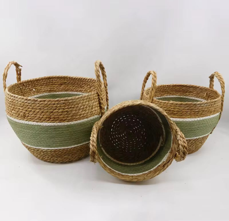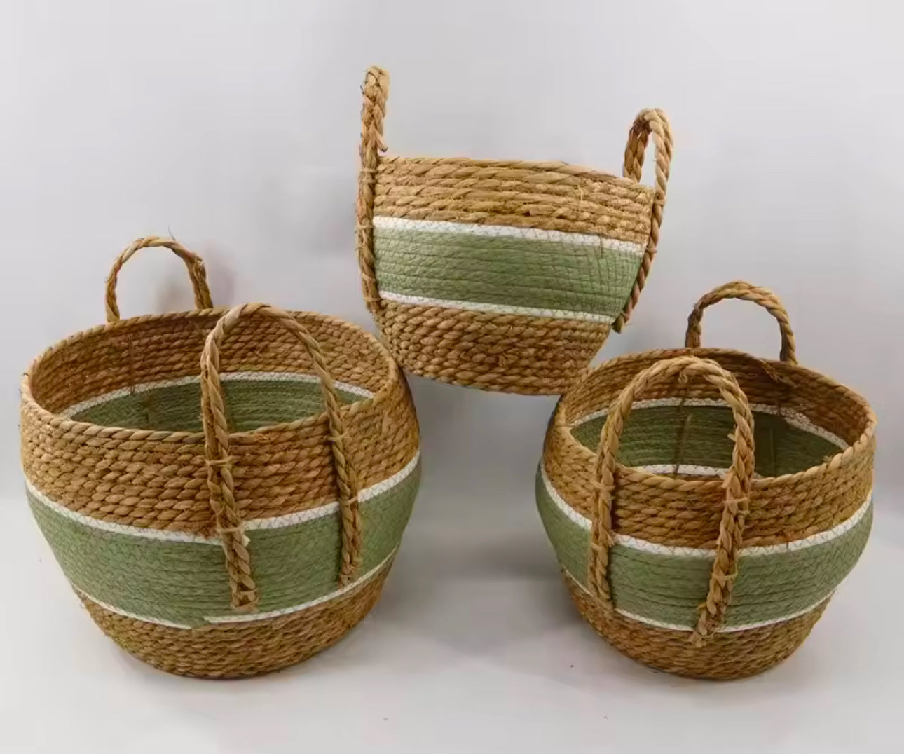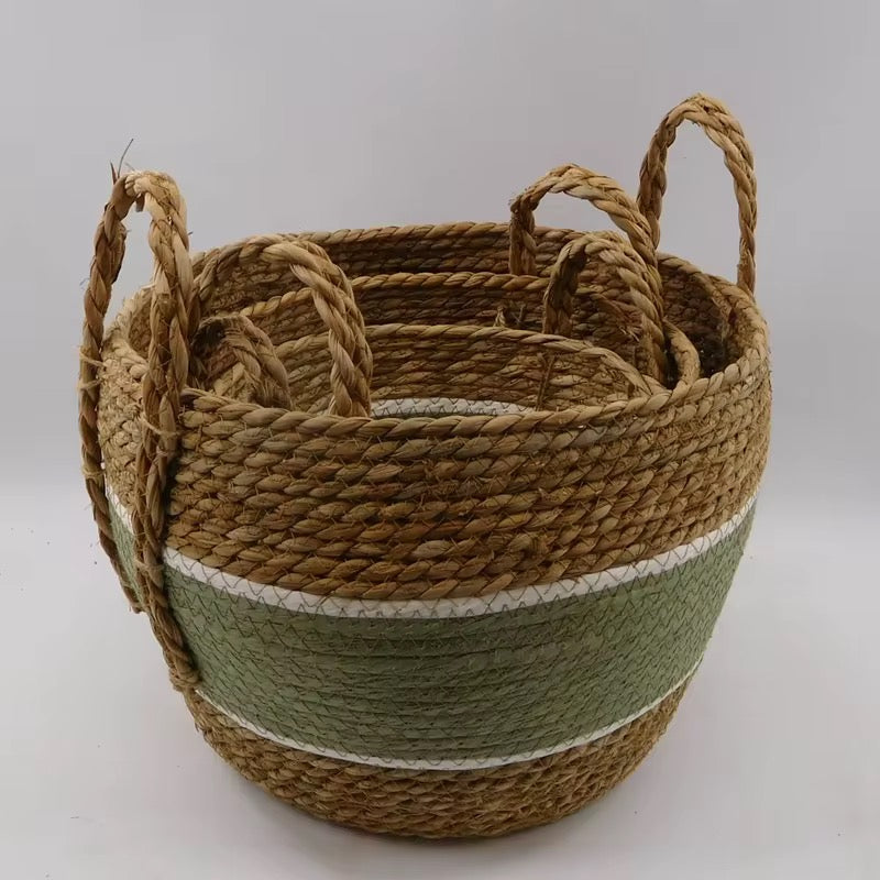 Shporta me imitim kashte me vijë jeshile dhe të bardhë, e pajisur me doreza praktike për transport të lehtë. Ideale për dekor, organizim apo si aksesor në evente me stil...