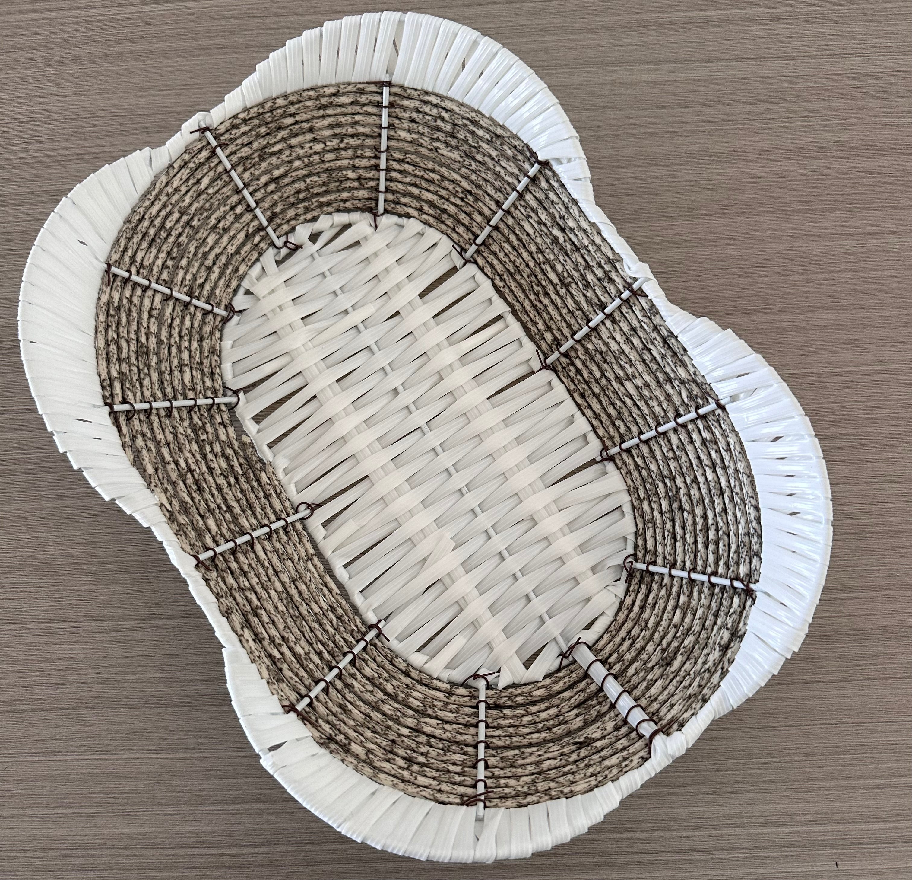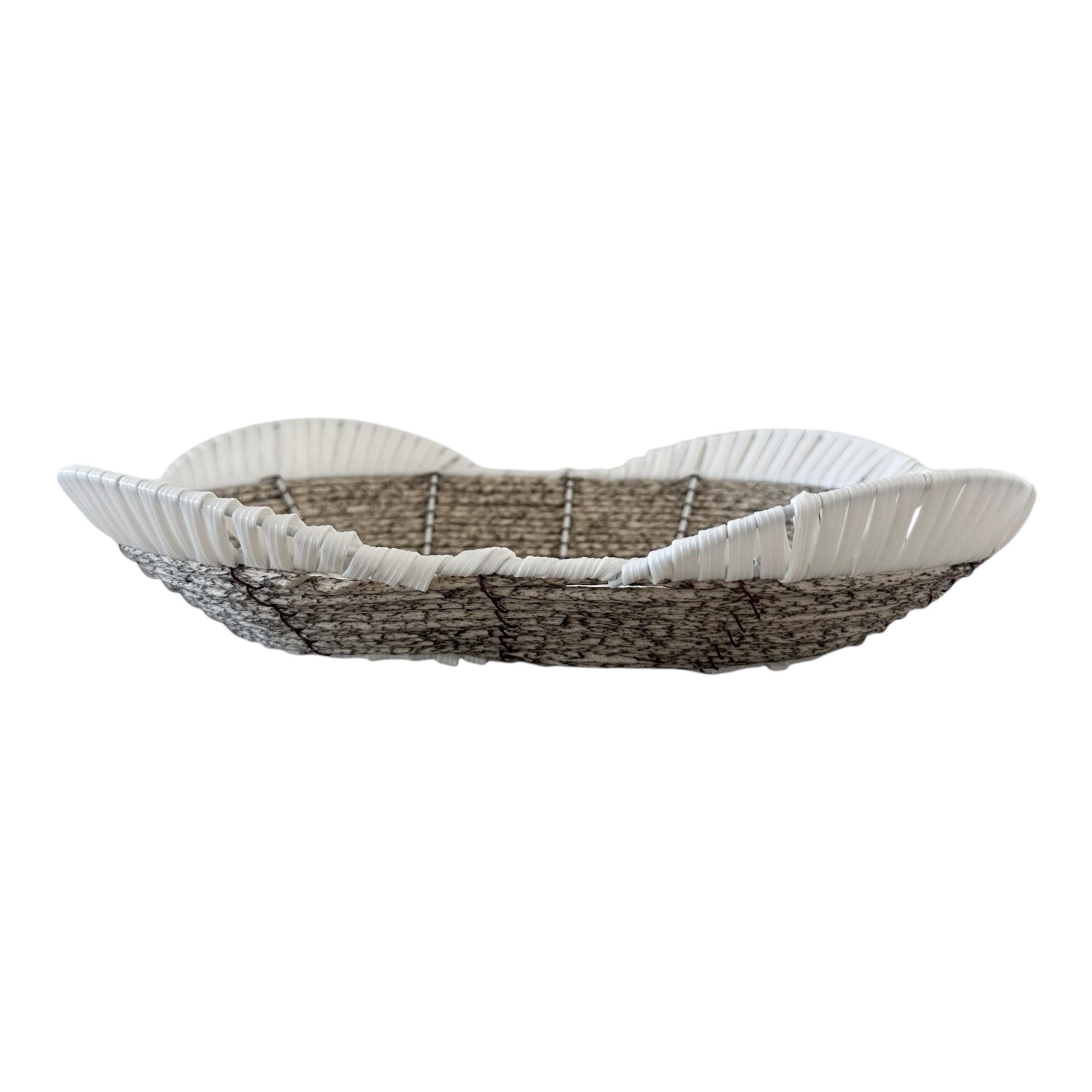 Shportë e cekët kashte me valëzime; Detaje të bardha; Përmasa: 30 cm x 20 cm