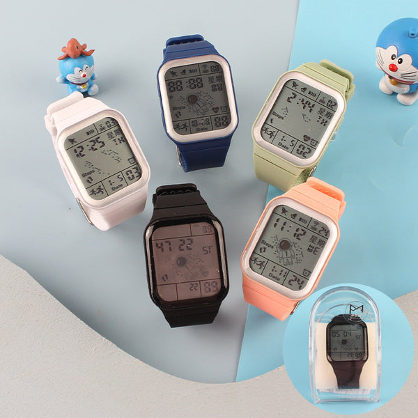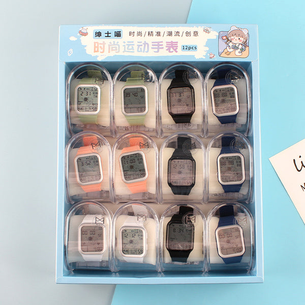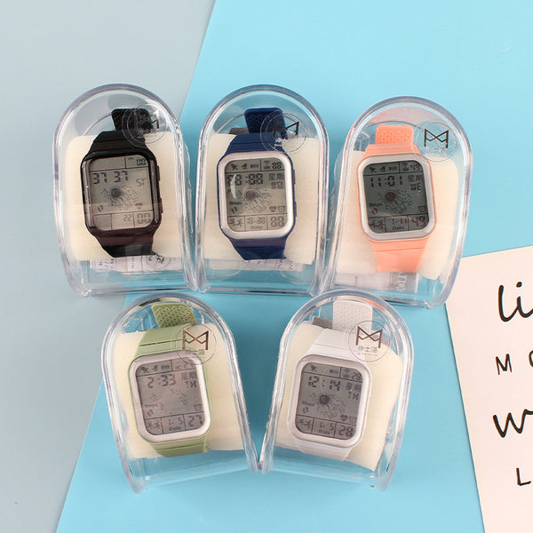 Smartwatch në formë drejtkëndore me rrip silikoni; Mat edhe sekondat; Mat hapat; Tregon rahjet e zemrës; me alarm; Materiali: PVC; Ngjyrat si në foto: