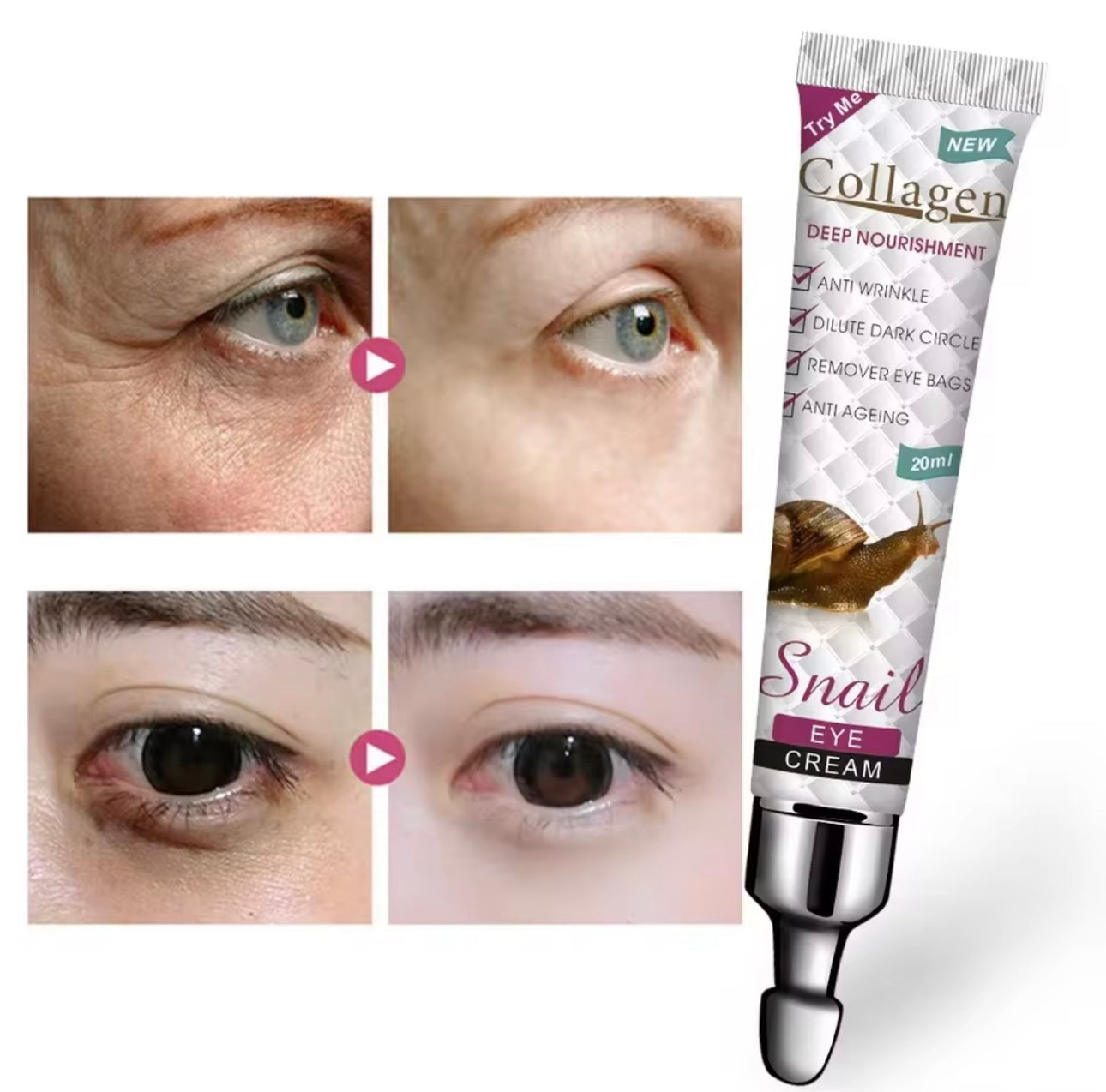 Krem për sytë me ekstrakt kërmilli dhe kolagjen, ndihmon në hidratim, zbutjen e rrudhave dhe reduktimin e rrathëve të zinj. Sasia: 20ml.