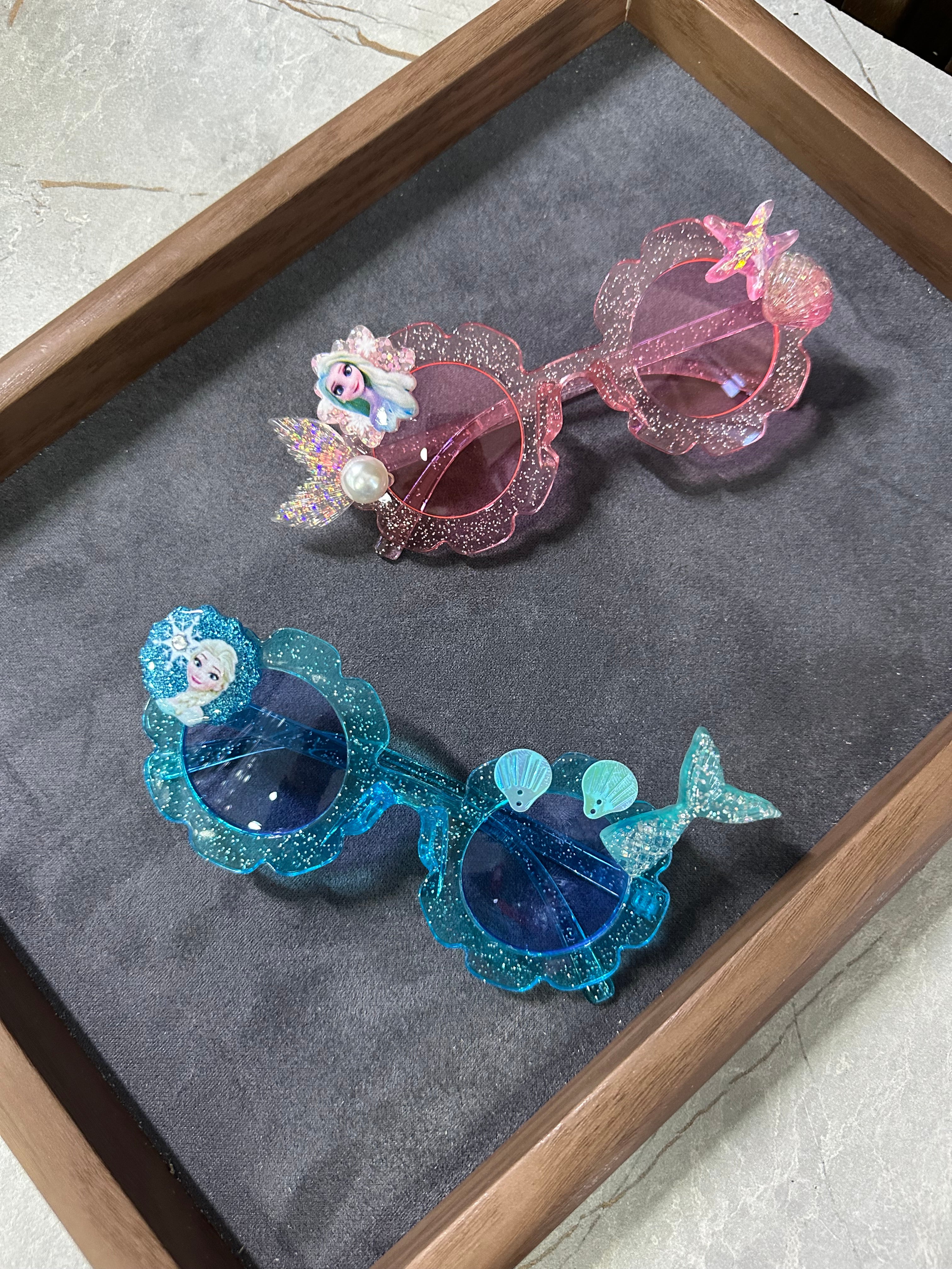Syze dielli për fëmijë me dizajn princeshe dhe sirene, me xhama ngjyrë pastel dhe detaje me shkëlqim. Ideale për stil argëtues dhe mbrojtje nga dielli. Ngjyrat: E rozë, e blu....