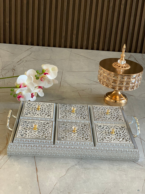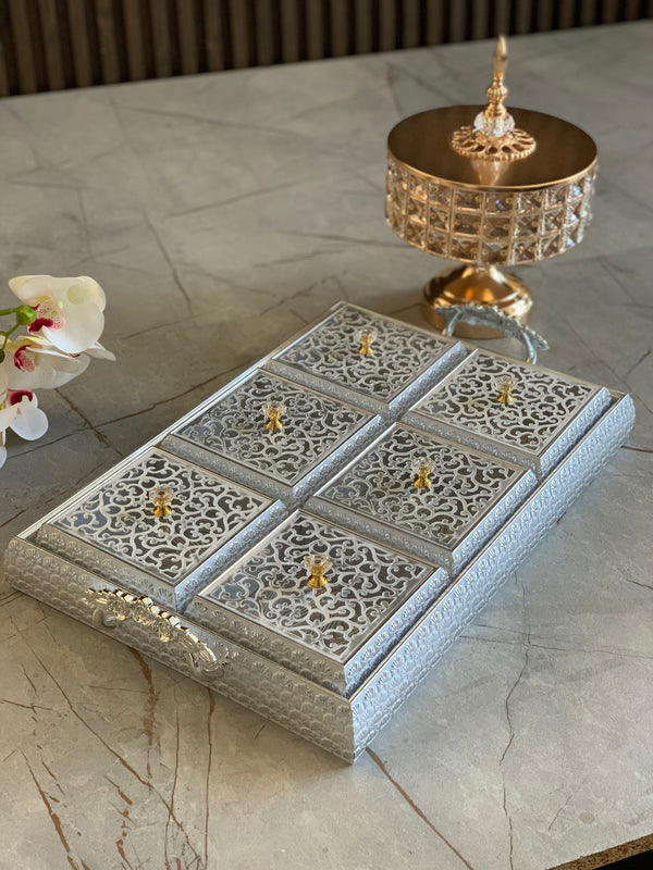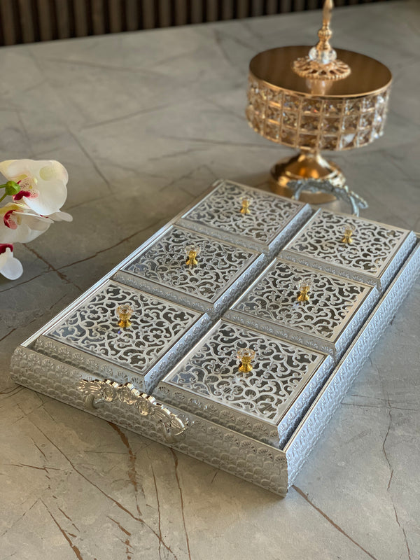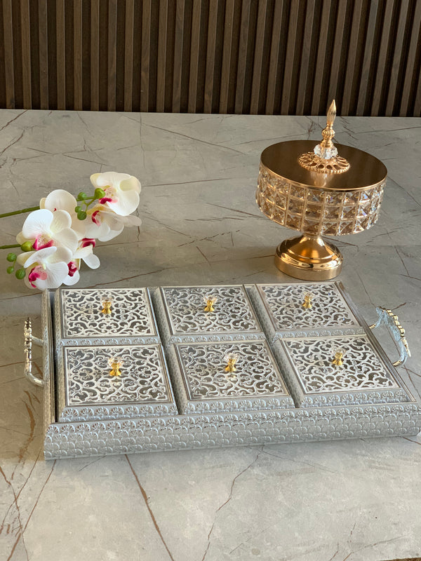 Servirni dhe dekoroni ne te njejten kohe. Tabakaja permban 6 kuti ku mund te vendosni gjera te ndryshme. Ngjyra: silver Dimensionet: 46*31*5cm