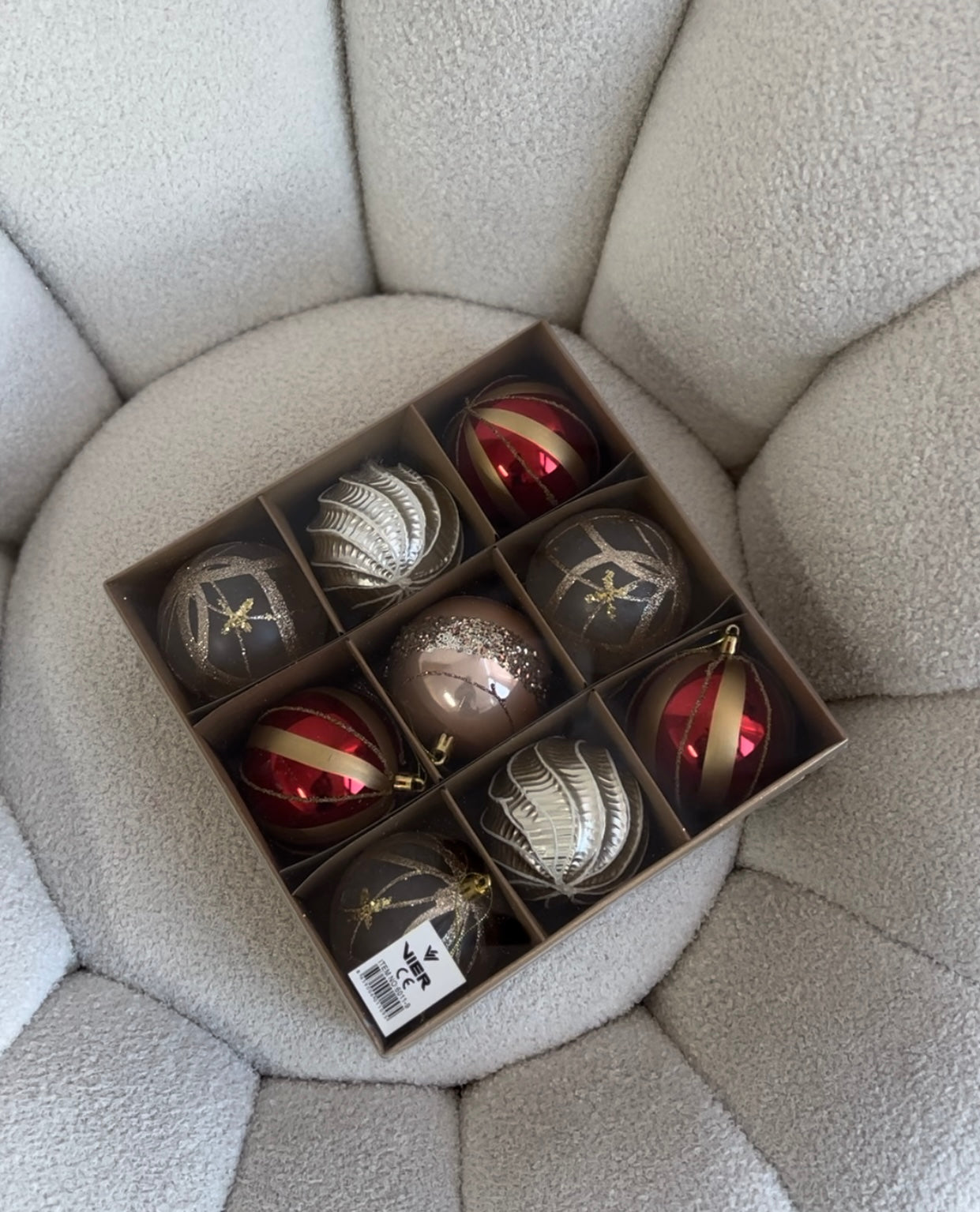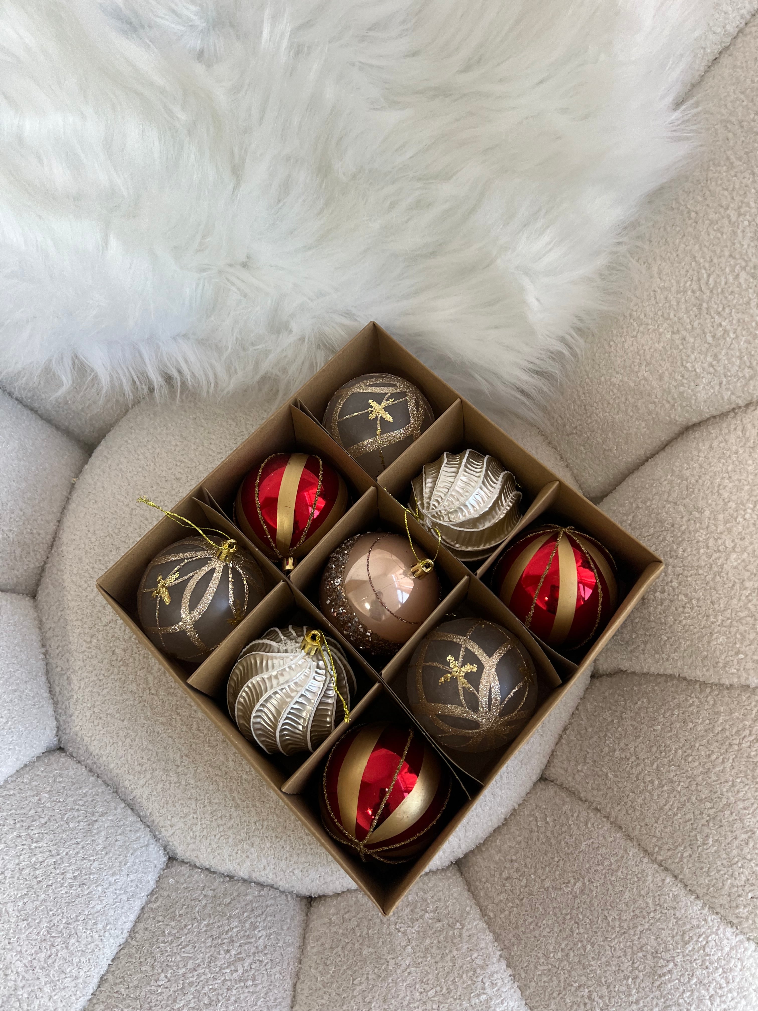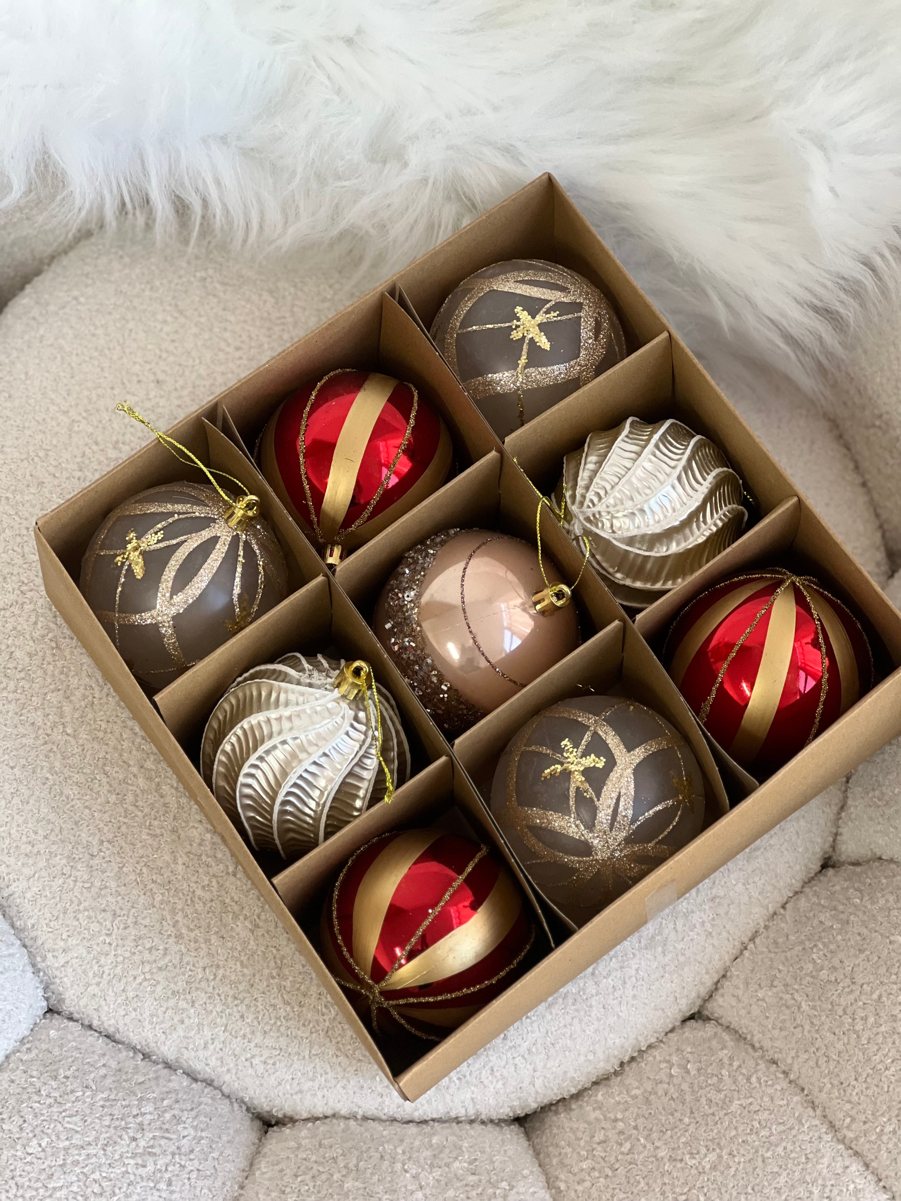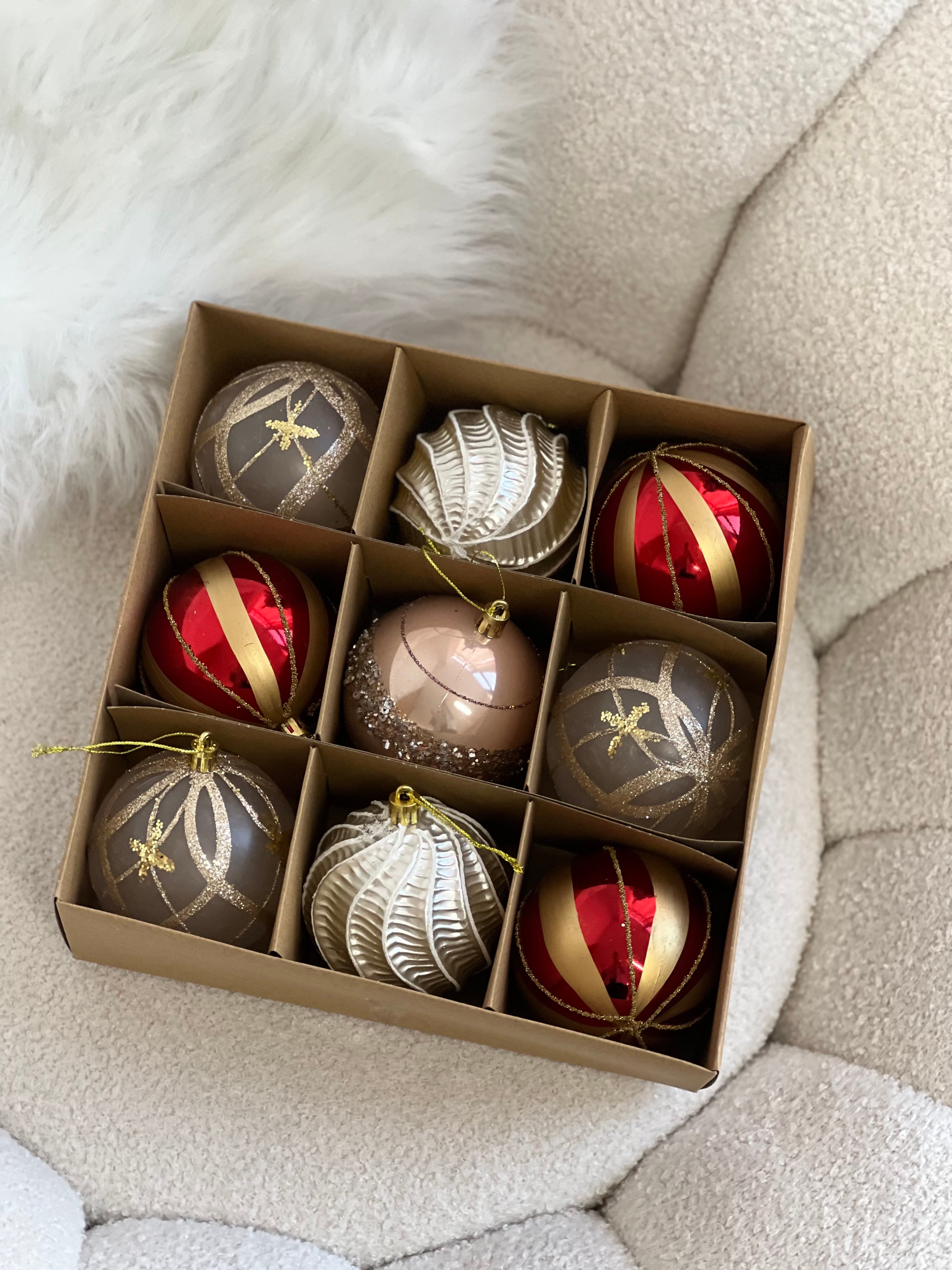 Seti vjen ne ngjyra te ndryshme por te kombinueshme me njera tjetren, duke i dhene pemes suaj nje larmishmeri te kendshme. Paketimi: 9 cope Diametri: 8cm