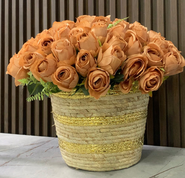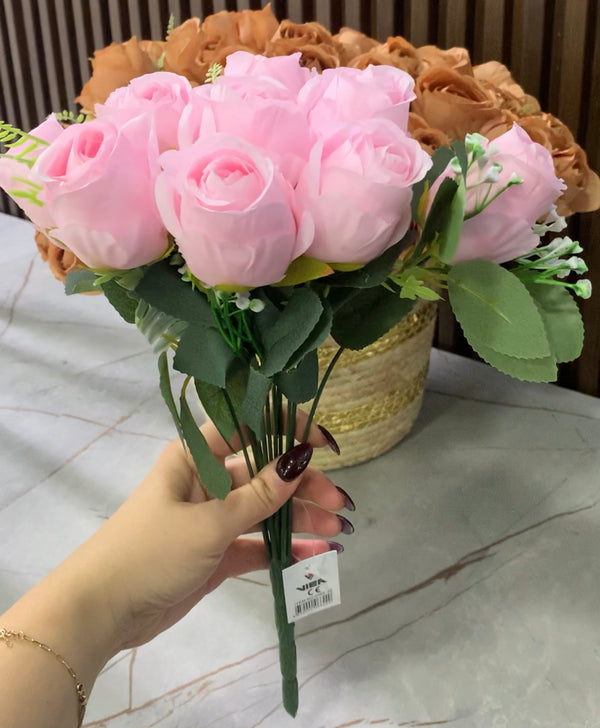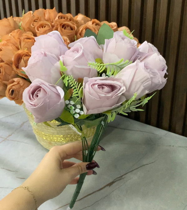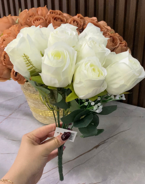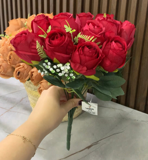 Tufë me 12trëndafila e lule shoqëruese me gjethe me gjatësi 37 cm në ngjyrat: e kuqe, e bardhë, portokalli, lejla, rozë