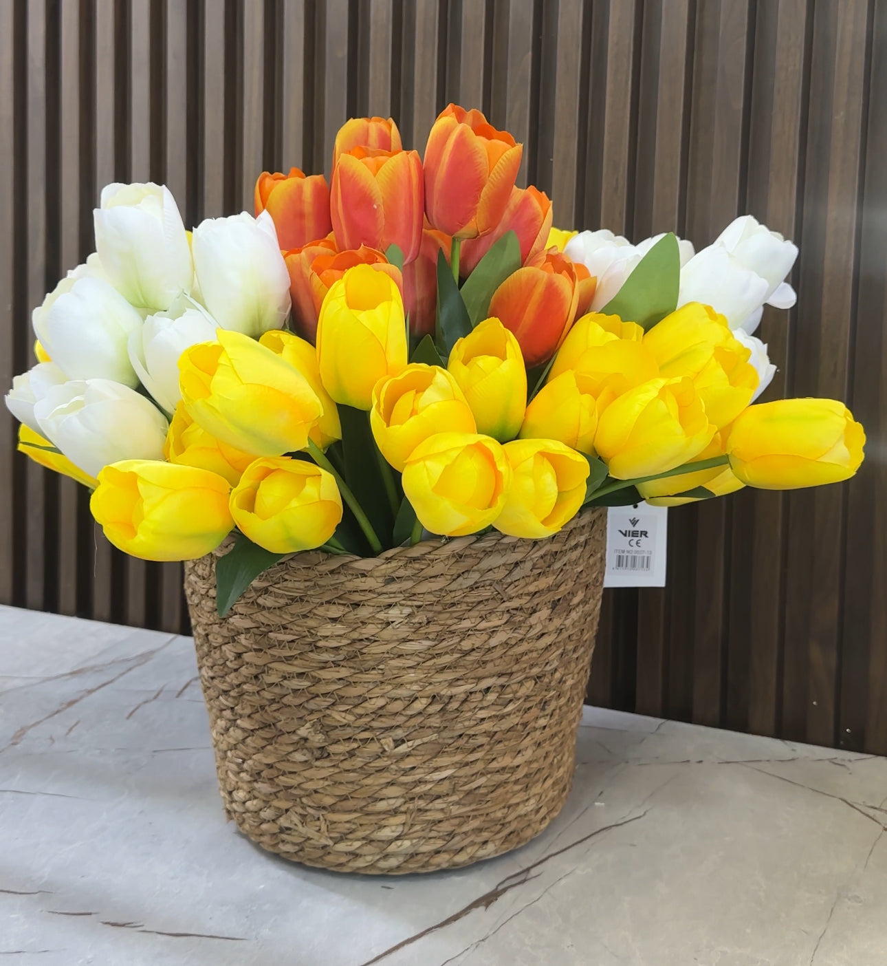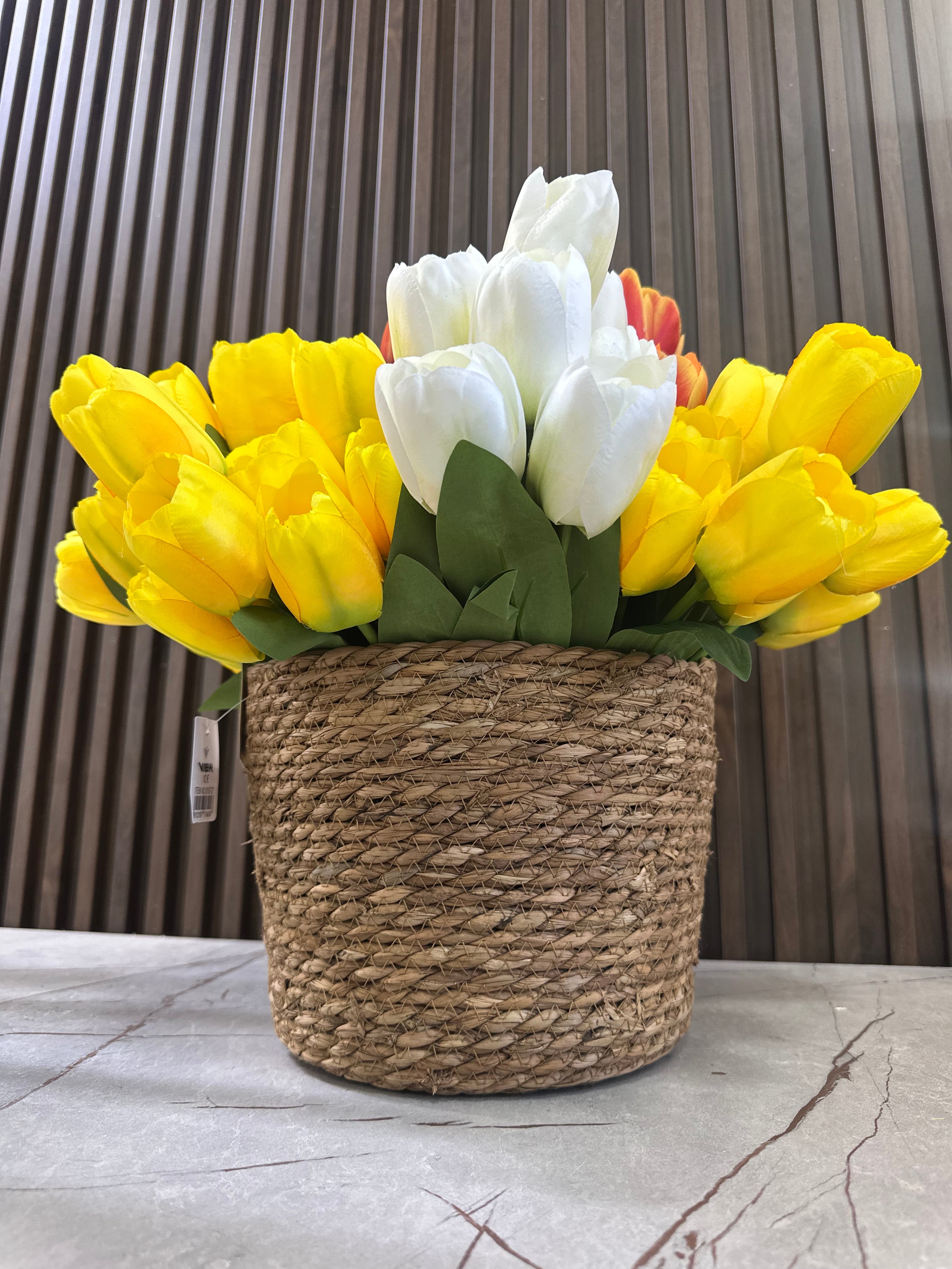 Tufë me tulipana me 9 koka e gjethe shoqëruese me gjatësi 41 cm në ngjyrat e bardhë, e verdhë, rozë, portokalli, e kuqe