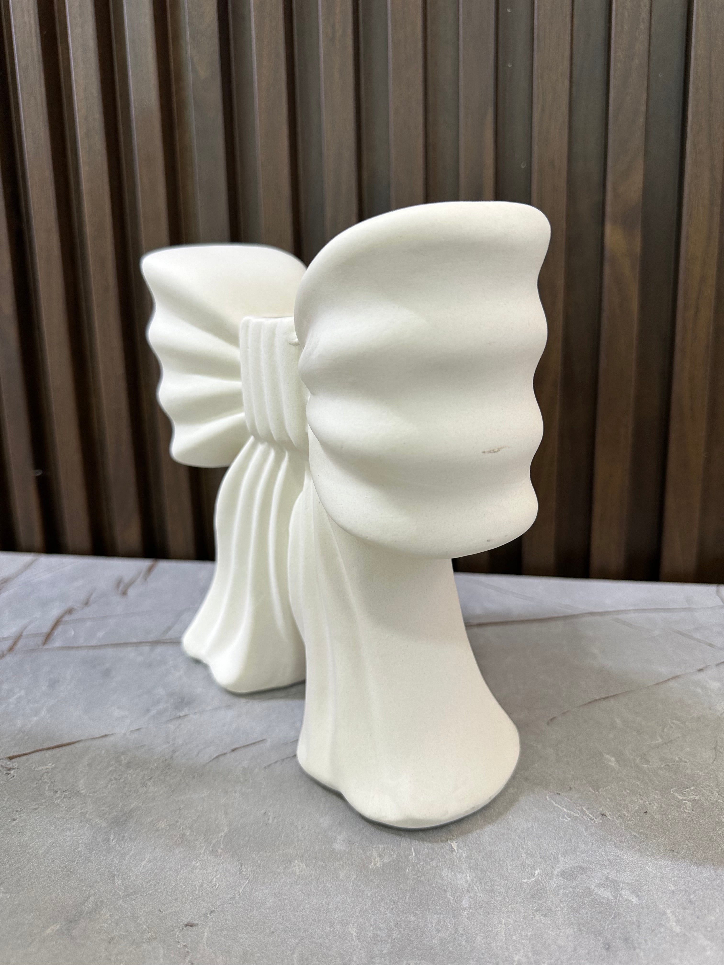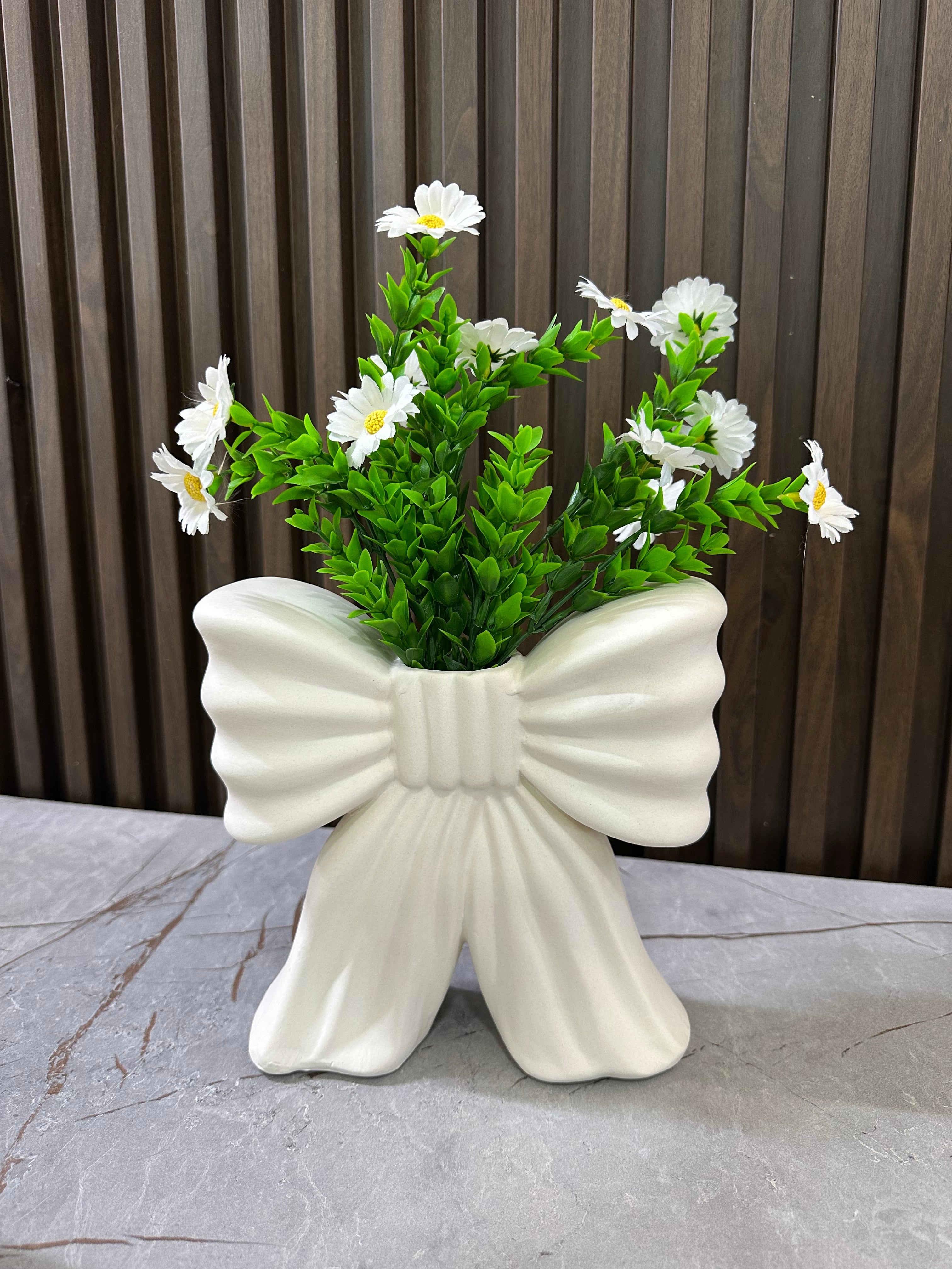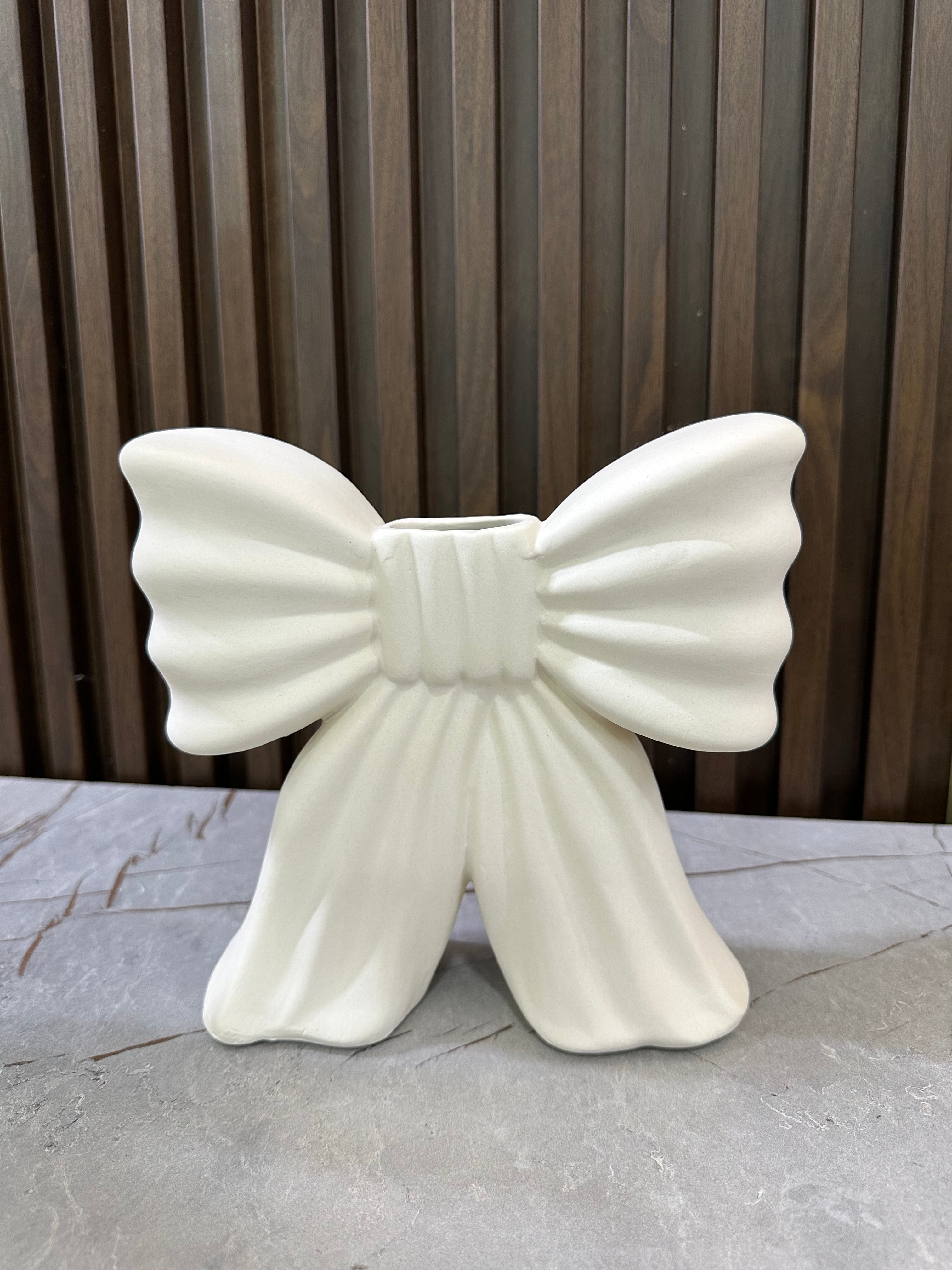Vazo dekorative në formë fjongoje. Ideale për lule artificiale apo natyrale, duke sjellë finesë në çdo ambient. Ngjyra: Qumësht. Përmasat: 18 x 18 x H19 cm.