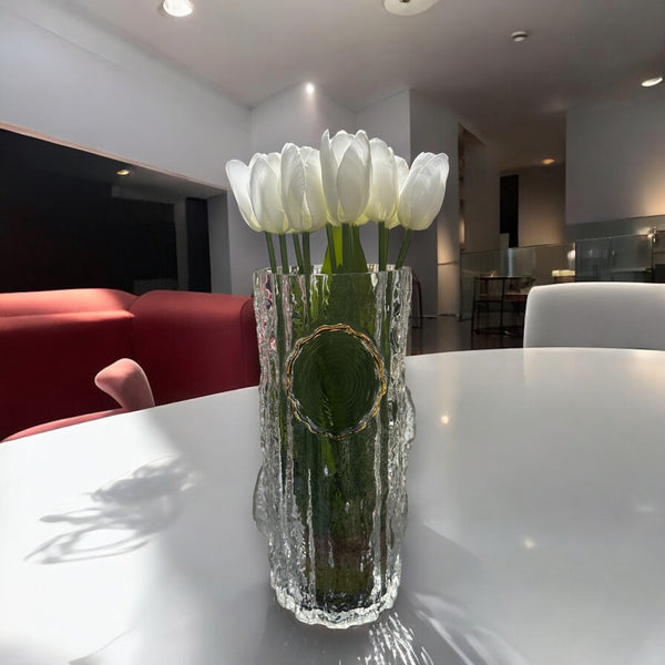 Vazo me gdhëndje; Transparente; Cepat ngjyrë gold; Stil modern; Gjatësi: 25 cm