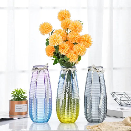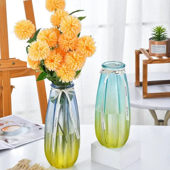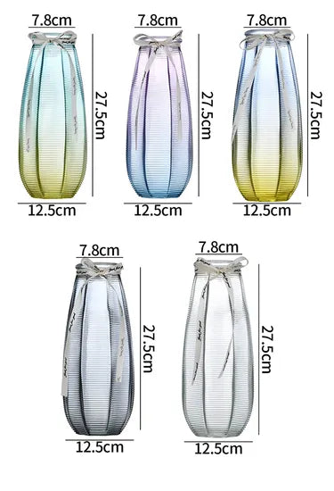 Vazo dyngjyrëshe me fjongo; Ngjyra: e verdhë me jeshile, rozë me blu;Material: Qelq; Përmasat si në foto: