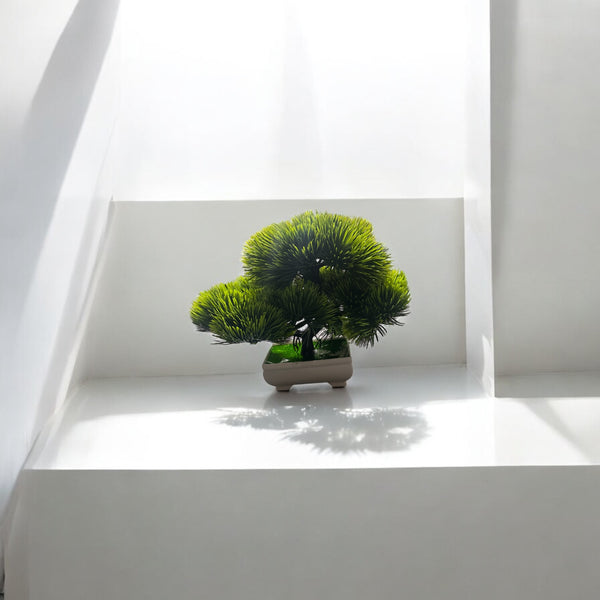 Vazo e bardhë plastike; me Bonsai artificial; Përmasa: 20 cm x 12 cm
