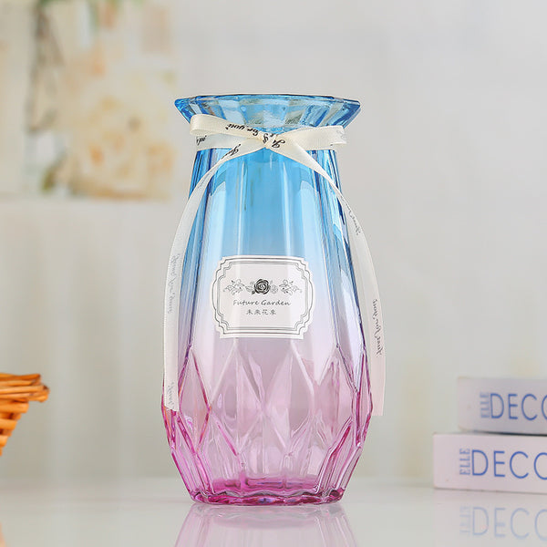 Vazo dyngjyrëshe me fjongo; Ngjyra: rozë me blu; Material: Qelq; Gjatësi: 18 cm