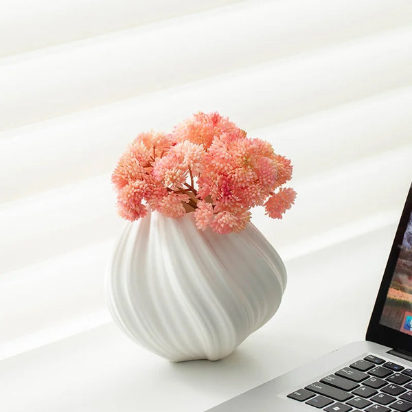 Vazo me dizajn valëzimesh, stil minimalist, ngjyrë e bardhë; qeramike; përmasat si në foto: 14.2 x 12 cm