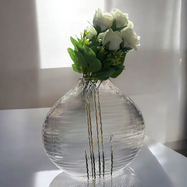 Vazo me linja gold; Stil modern; Materiali: Qelq; Përmasat: 25 cm