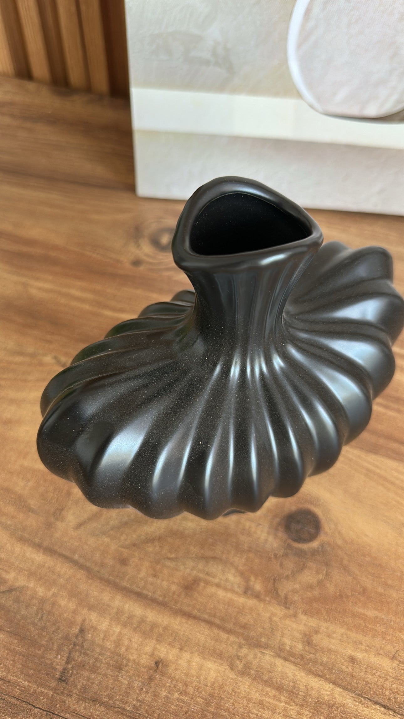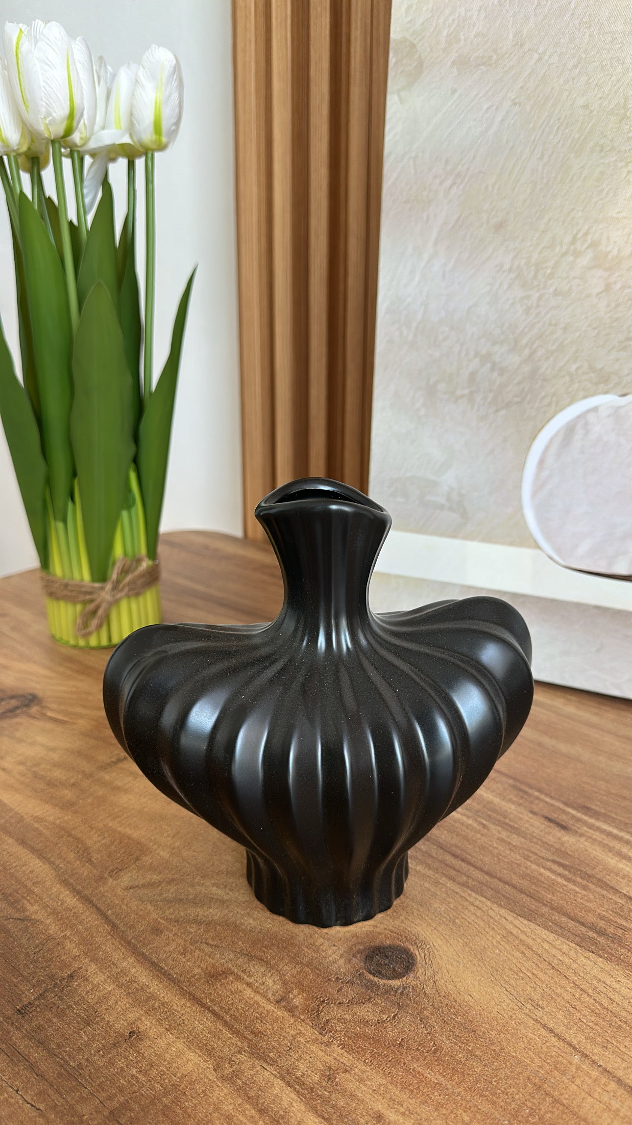 Vazo dekorative qeramike në ngjyrë të zezë mat me formë unike dhe vijëzime elegante. Një aksesor modern që sjell stil dhe finesë në çdo hapësirë. Përmasa: 4 x 3 x...
