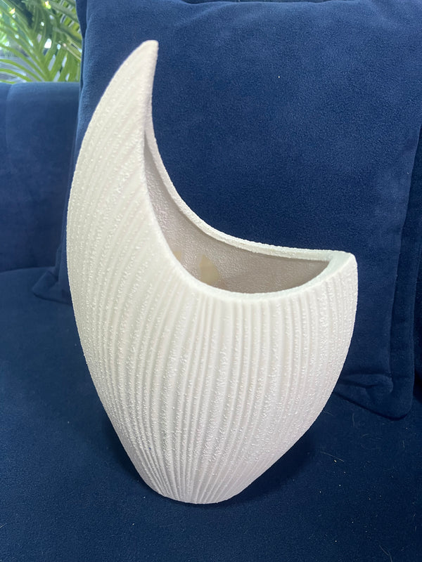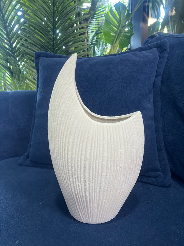 Vazo qeramike dekorative me formë moderne dhe dizajn gjysmëhëne. E punuar me teksturë mat dhe ngjyrë neutrale, përshtatet në mënyrë perfekte me çdo stil arredimi. Ideale për lule artificiale ose...