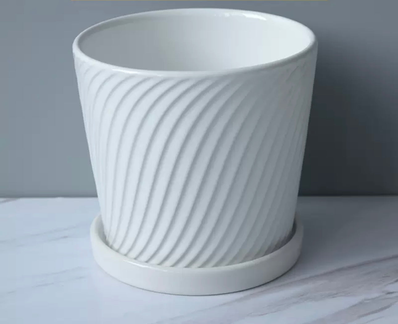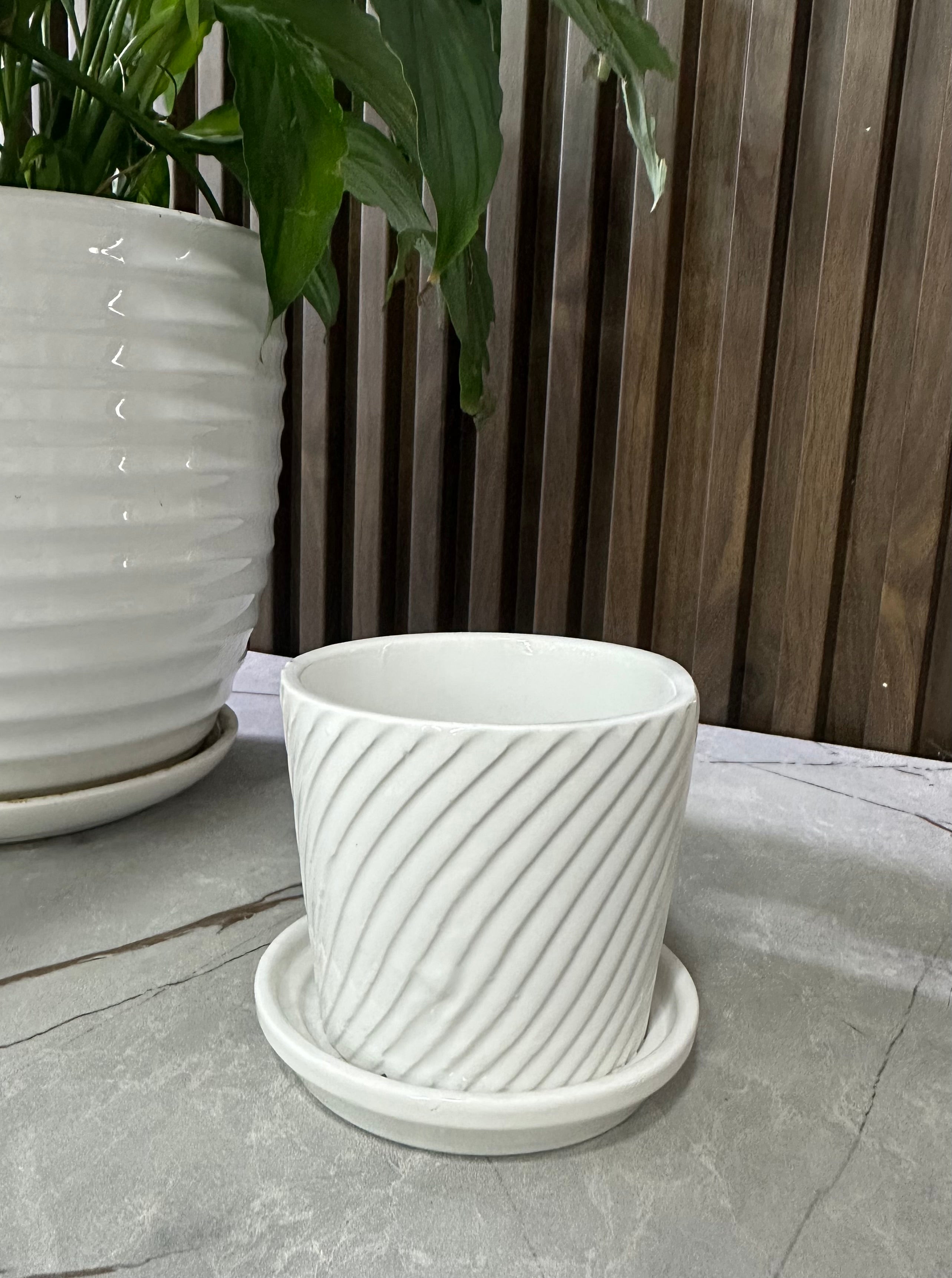 Vazo qeramike me dizajn reliev spiral, ngjyrë e bardhë, ideale për lule dhe bimë dekorative. Ngjyrat: E bardhë. Përmasat: 9.4 x H9 cm. Dizajni: Me vija të përdredhura.