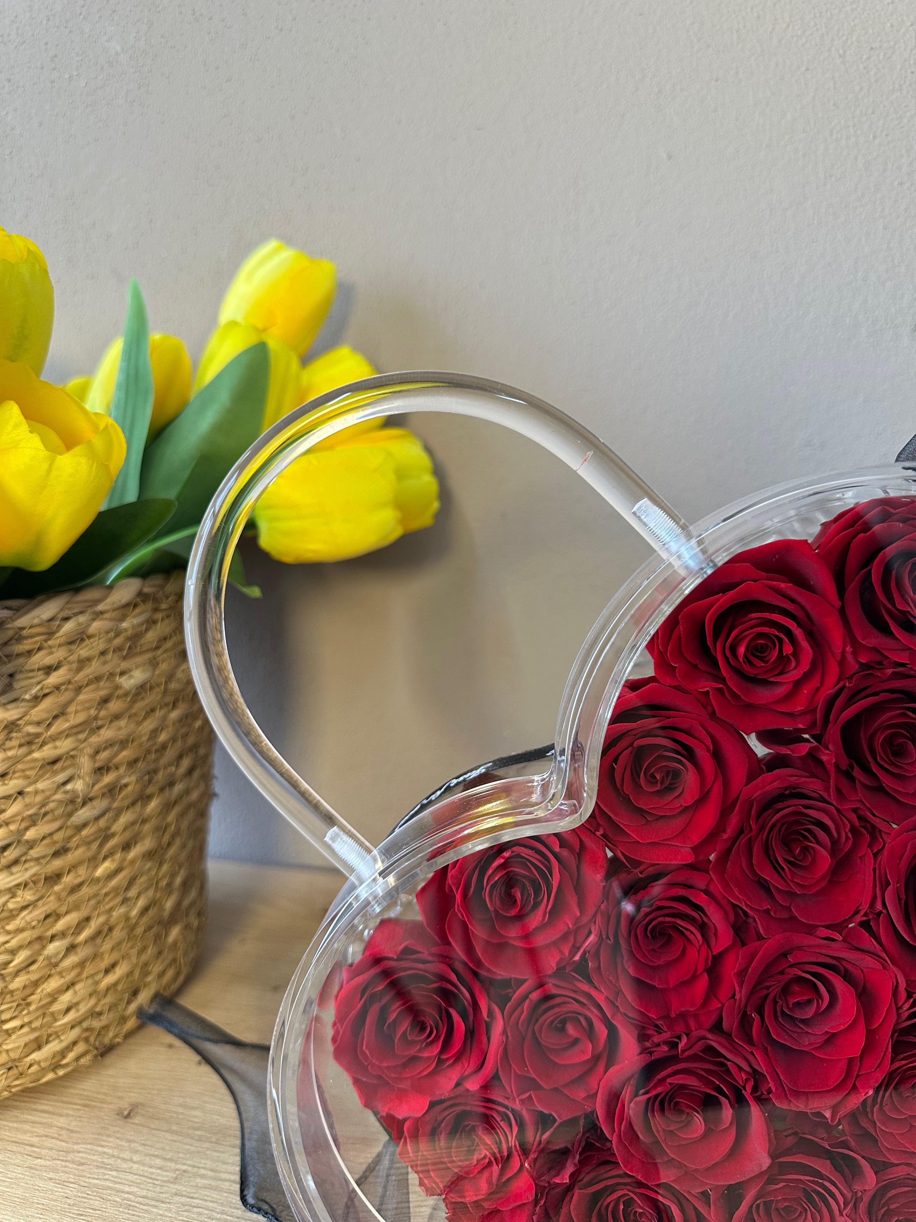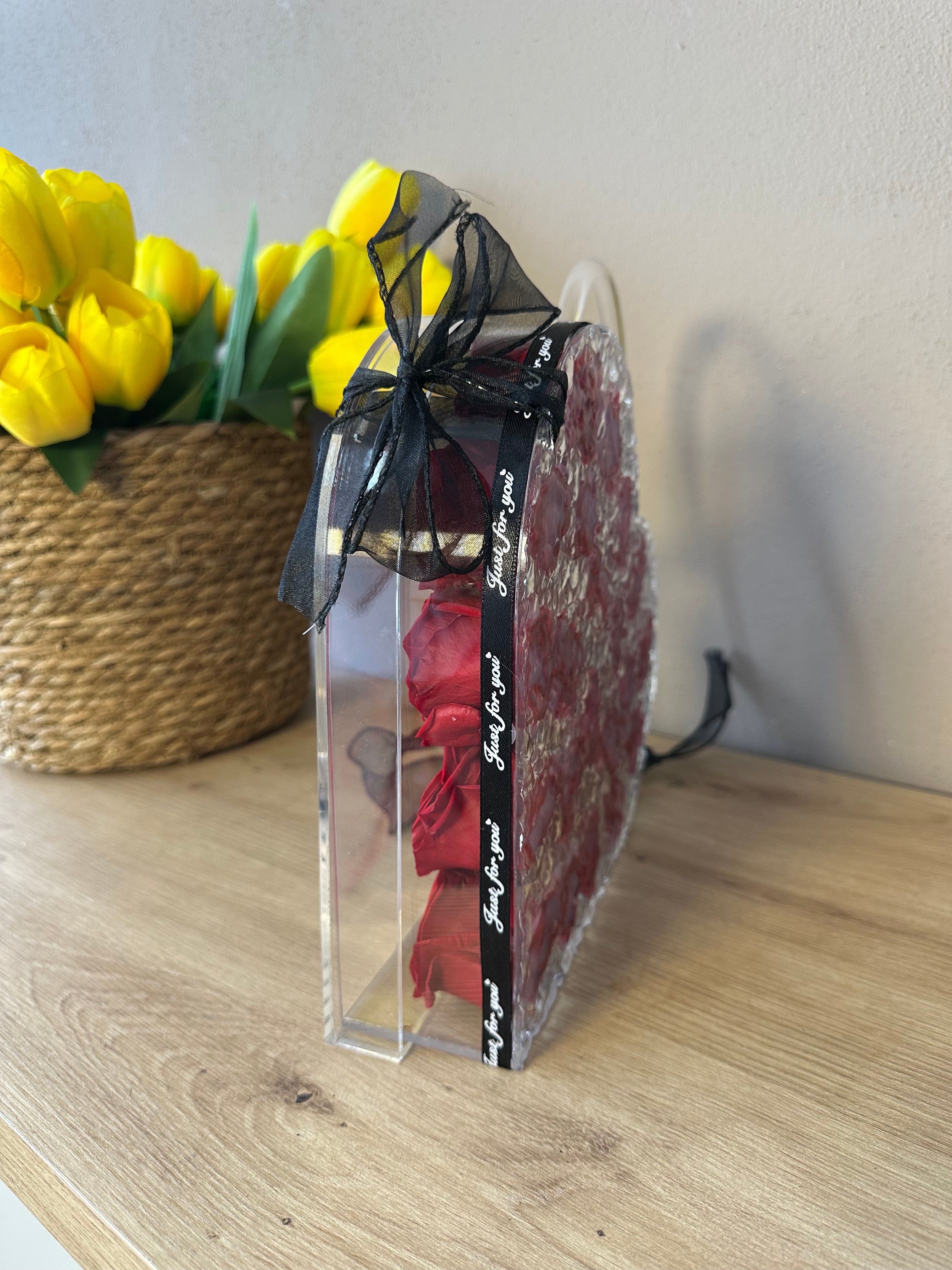 Zemër në formë cante akrilik me trëndafila të kuq